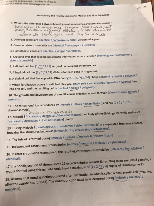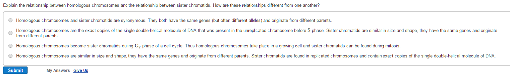Solved How Are Sister Chromatids And Homologous Chromosomes Different From Each Other Homologous Chromosomes Are Identical Copies Of Each Other One Sister Chromatid Comes From The Father And One Comes From The Mother